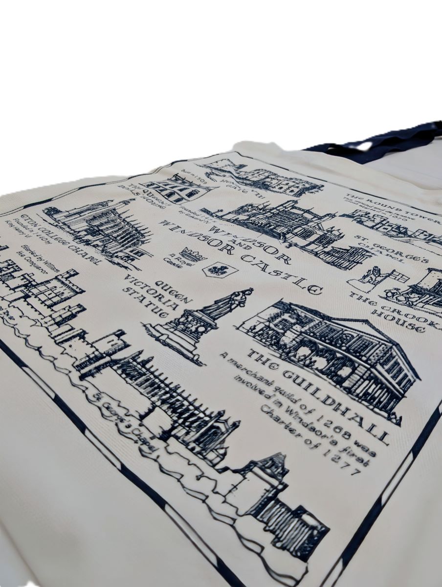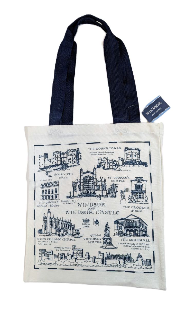 This beautiful cotton tote bag is the perfect all rounder. Depicting the most prominent landmarks found around Windsor, it offers exquisite illustrations of the Castle, the Round Tower, Henry the VIII gate, St George's Chapel, the Queen Victoria statue, the crooked house and the Guildhall, accompanied by names and dates.
