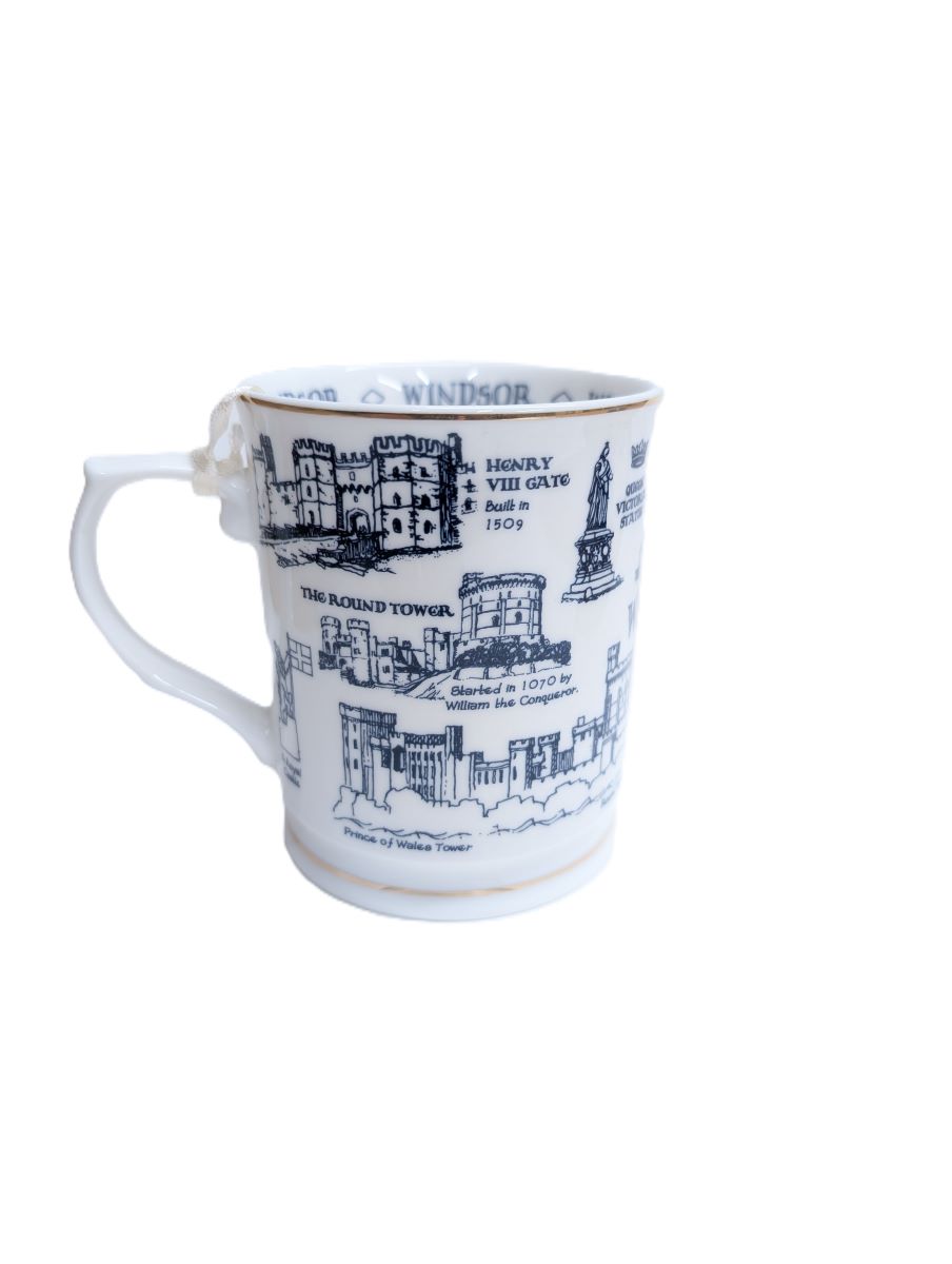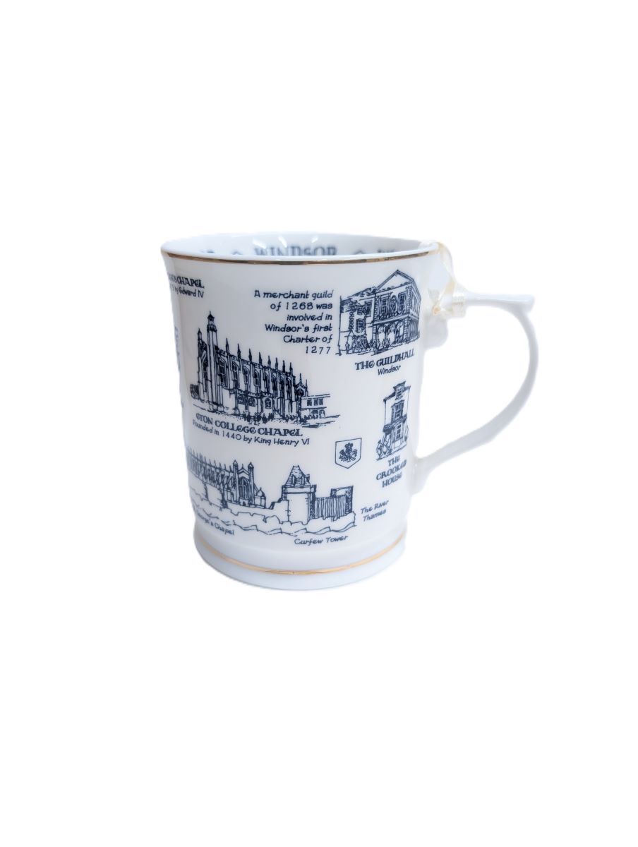 This beautiful bone china tankard style mug is the perfect all rounder. Depicting the most prominent landmarks found around Windsor, it offers exquisite illustrations of the Castle, the Round Tower, Henry the VIII gate, St George's Chapel, the Queen Victoria statue, the crooked house and the Guildhall, accompanied by names and dates. It is very cleverly executed offering a 360o interest point without repetition, framed by gilding at the top and bottom of the mug.