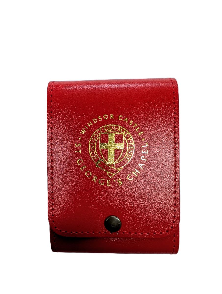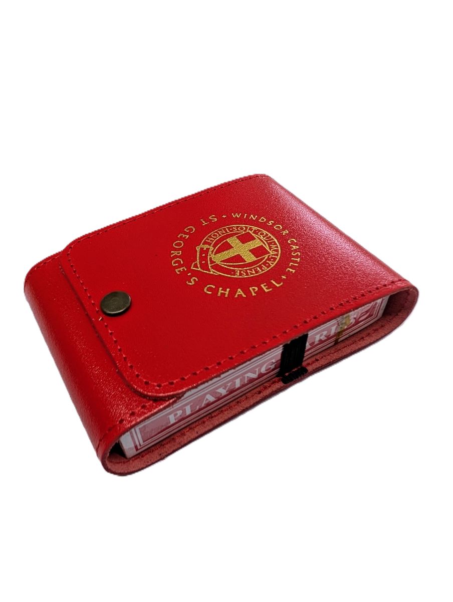 Standard playing cards in Beautiful red genuine leather carry case, adorned with a golden College of St George badge. This Leather case is made in the UK by a family owned business.