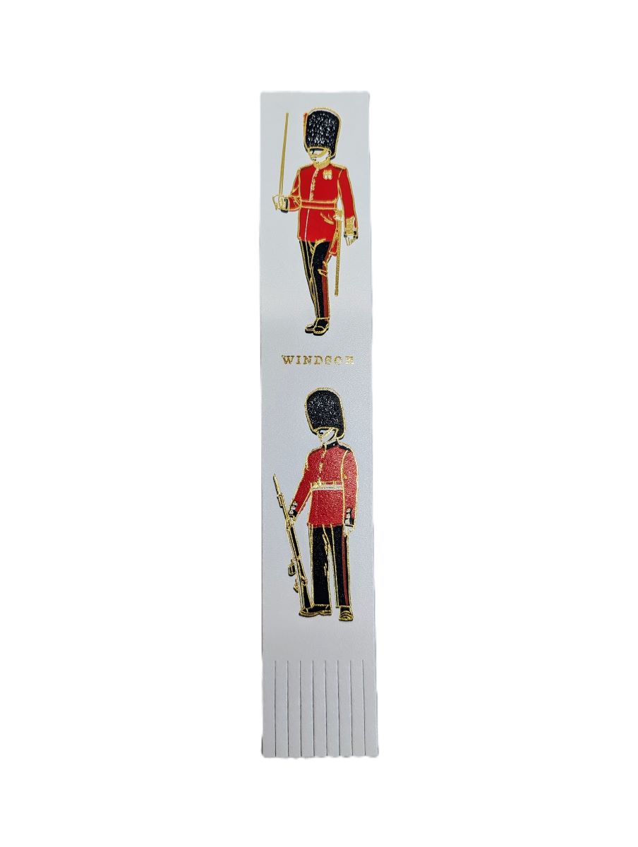 Charming genuine leather bookmark depicting the iconic Guardsmen in traditional uniform. The King's Guard can be seen at Windsor castle as they stand on sentry duty or march during the Changing of the Guard.